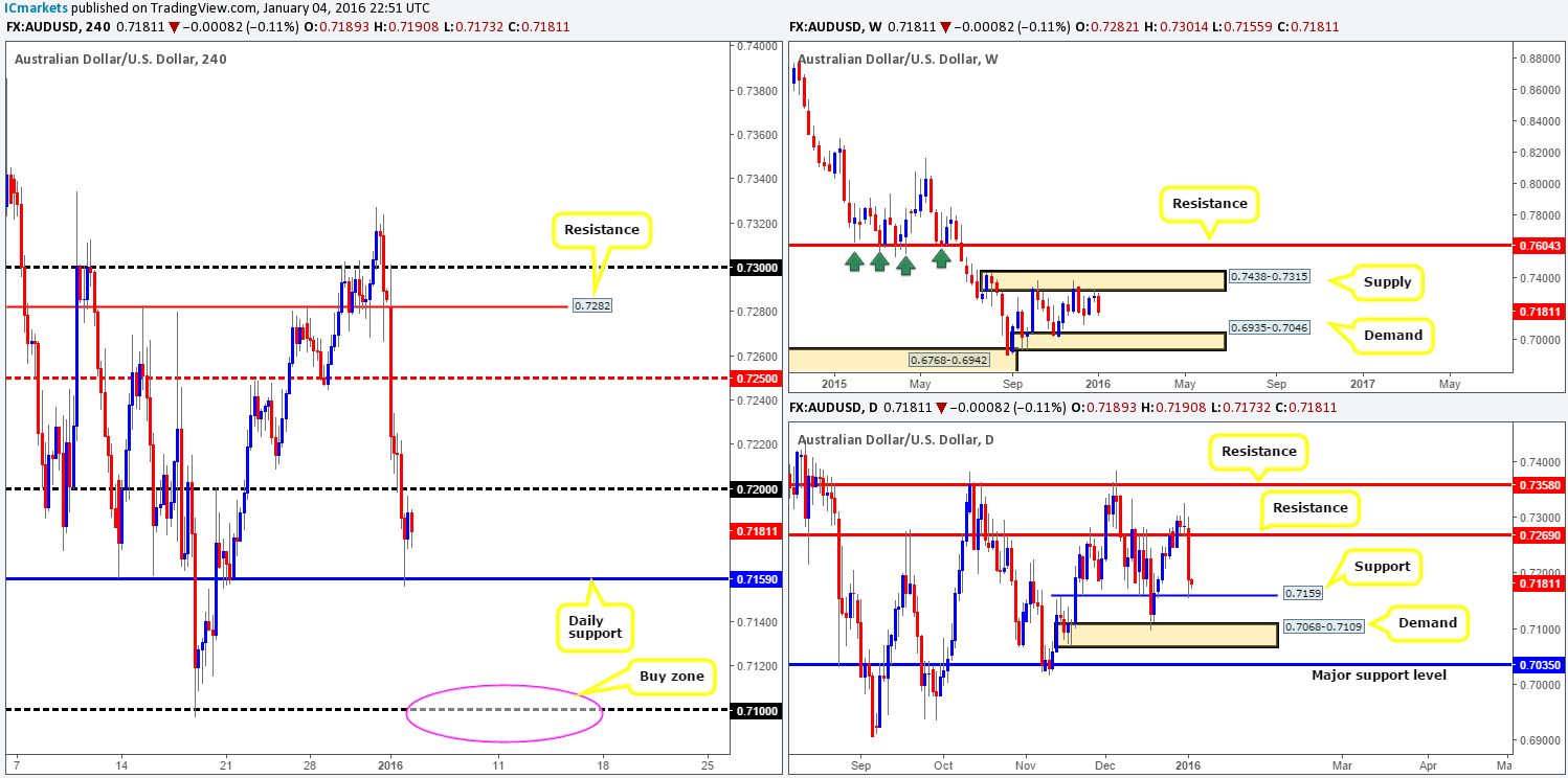 - Buys: Watch for offers to be taken out around 0.7200 and then look to trade any retest seen thereafter (lower timeframe confirmation required). 0.7100 region [Tentative – confirmation required] (Stop loss: best to be placed below daily demand around the 0.7065 area).