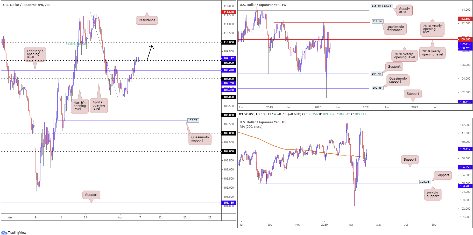 Technical studies moved weekly price through its 2020 yearly opening level at 108.62 in recent trade consequently drawing the 2019 yearly opening level at 109.68 into sight as possible resistance. Lower on the curve, daily price toppled its 200-day SMA at 108.31, potentially providing an early cue we may be headed for 109.68 on the weekly timeframe.