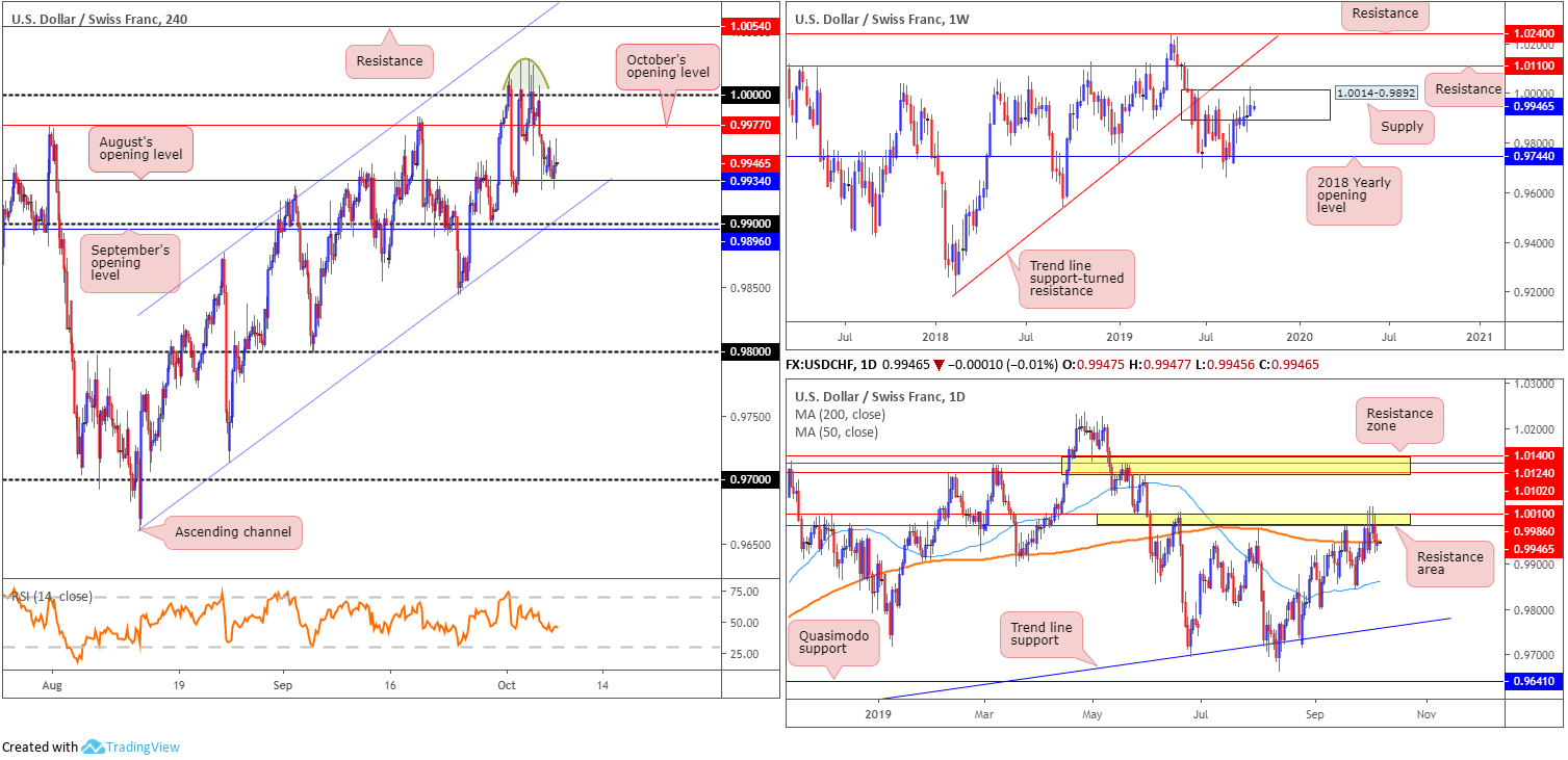 - Should H4 price remain rangebound between 1.0000/0.9934, range traders may look to buy/sell these limits.