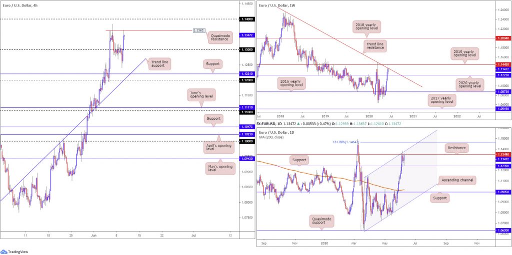 Moving things across to the weekly timeframe, buyers remain in a healthy position despite facing the wrath of long-standing trend line resistance, extended from the high 1.2555. Of course, the trend line resistance may still lure price lower, perhaps reconnecting with 1.1222. Further upside, though, could have the unit cross swords with the 2019 yearly opening level at 1.1445.