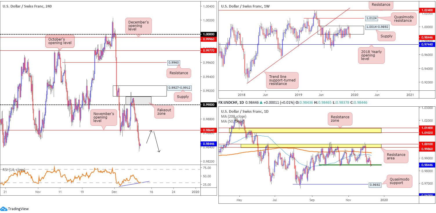 Tuesday witnessed additional selling materialise, drawing the H4 candles beyond November’s opening level 0.9864 to lows of 0.9833. Despite seller strength, a correction is likely to take shape today/this week, as not only is the H4 relative strength index (RSI) producing bullish divergence out of oversold territory, daily price also recently crossed paths with the lower edge of a 3-month range at 0.9845. This may prompt a retest to the underside of 0.9864.