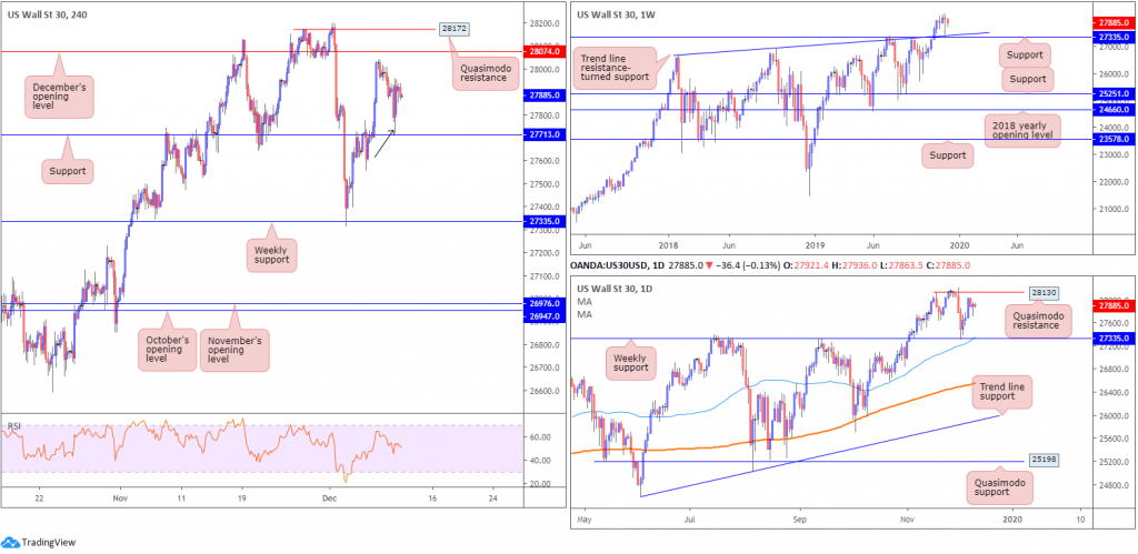 Technically, H4 price came within striking distance of support at 27713 Tuesday and turned higher. As you can see, this level of support has boasted reasonably significant history since the beginning of November, therefore, further buying towards December’s opening level at 28074 may come to fruition.