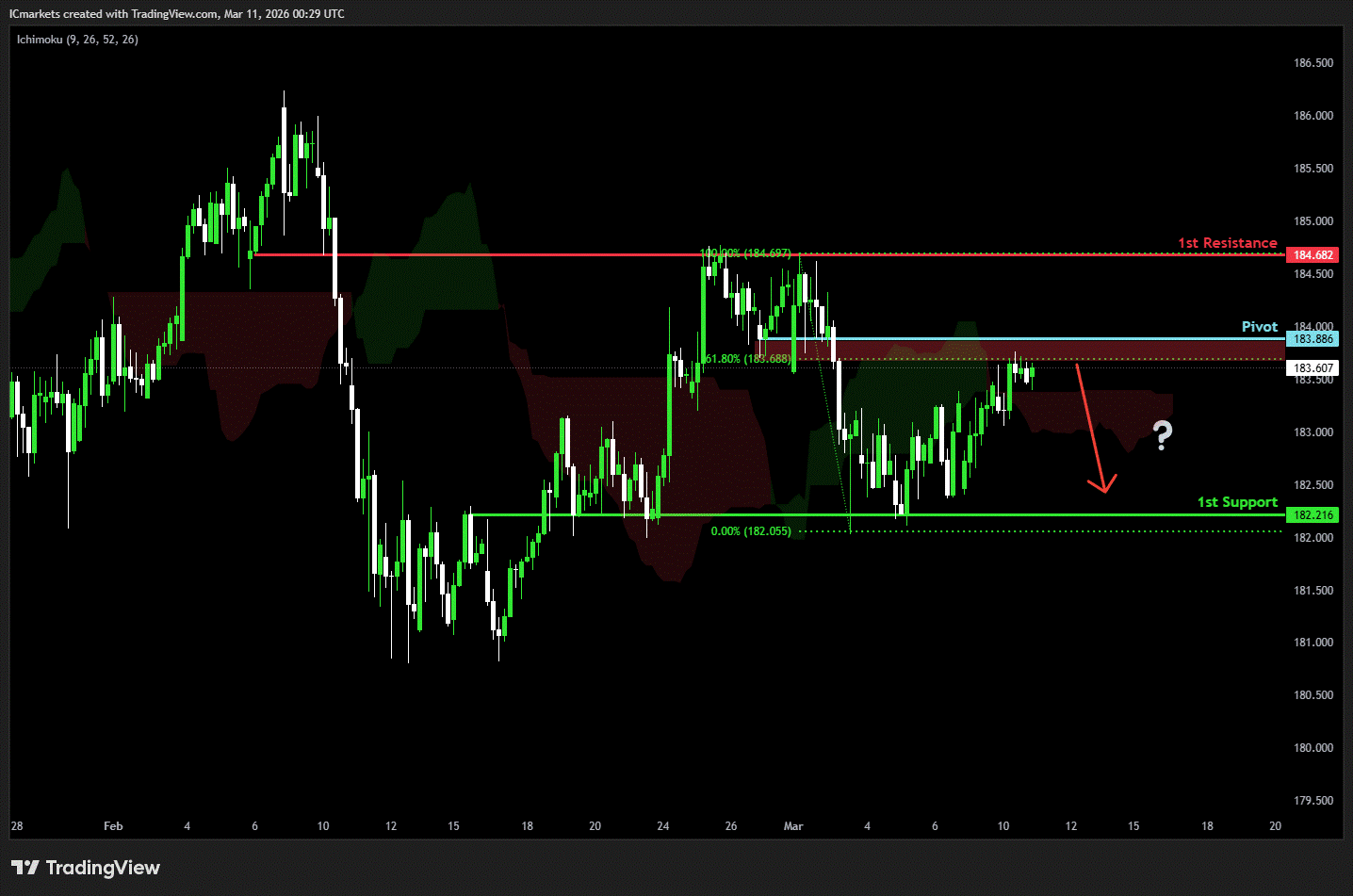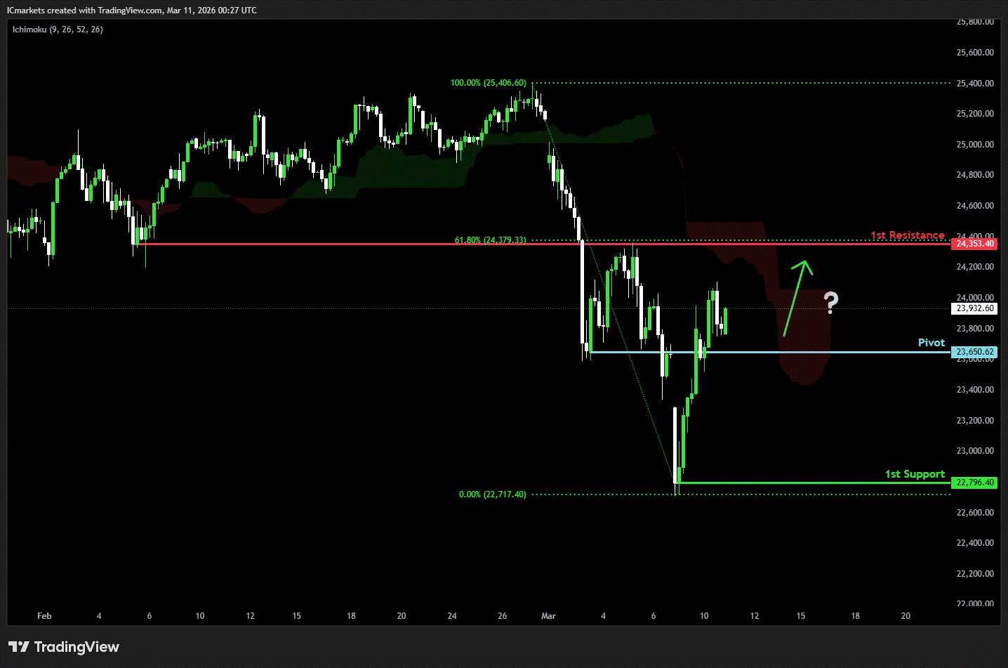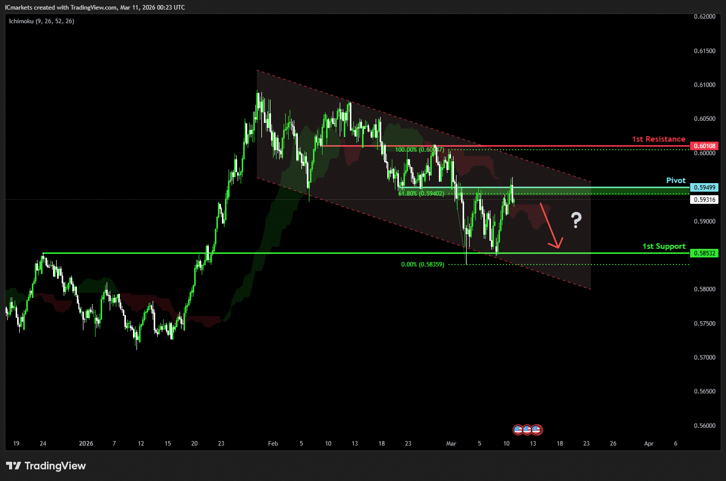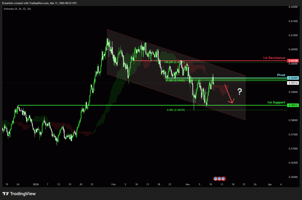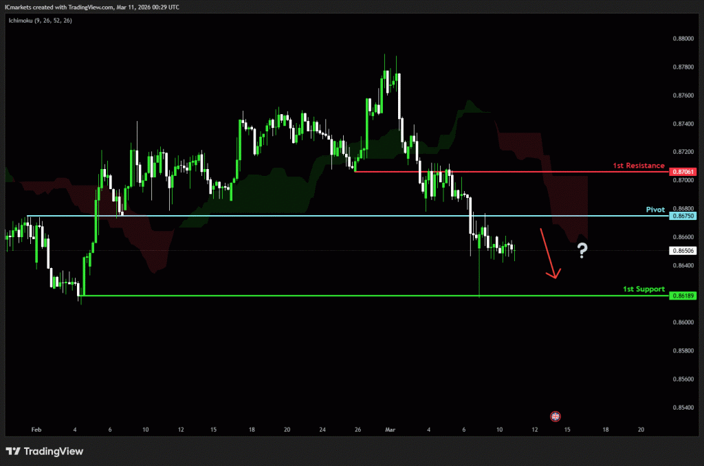 The price could see a short-term pullback toward the pivot before continuing its bearish move down toward the 1st support.