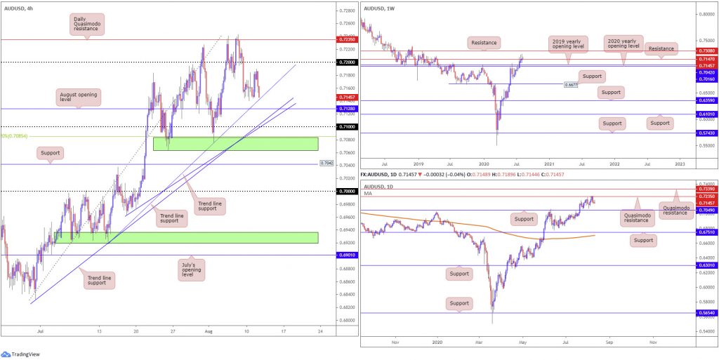 Waning momentum seen on the weekly timeframe, together with Friday sinking from Quasimodo resistance at 0.7235 on the daily timeframe, suggests a test of the three H4 trend line supports highlighted above in bold and round number 0.71. It is also possible we draw in the H4 support area noted at 0.7063-0.7083 (and 38.2% Fibonacci support at 0.7085).