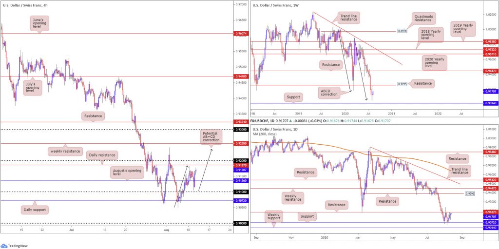 Recording a fourth successive advance yesterday, further buying, moves that form north of daily resistance and the 0.92 handle on the H4 timeframe, could have the H4 candles shake hands with a potential AB=CD (black arrows) correction at 0.9237, followed by weekly resistance at 0.9255.