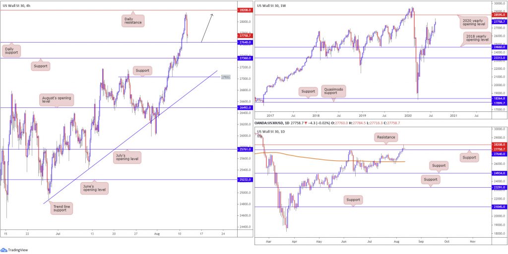 Technically, from the weekly timeframe, we recently secured ground above the 27638 high, following a mid-June retest at the 2018 yearly opening level from 24660. As we head into Wednesday, the unit is now poised to run to the 2020 yearly opening level at 28595. After retesting the 200-day SMA (orange – 26258) on the daily timeframe, in the form of back-to-back hammer candle patterns, recent trading crossed resistance at 27640 (now a serving support) and came within touching distance of connecting with resistance at 28208.