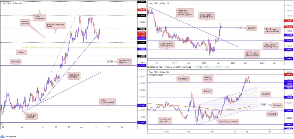 Tuesday, as anticipated, responded to 1.1733 weekly support, with the help of H4 trend line support, etched from the low 1.1254. From here we ran through August’s opening level at 1.1771 and shook hands with the 1.18 handle. Unfortunately, given the DXY traded considerably off worst levels, we failed to make it past 1.18 and pulled back under August’s opening level at 1.1771.
