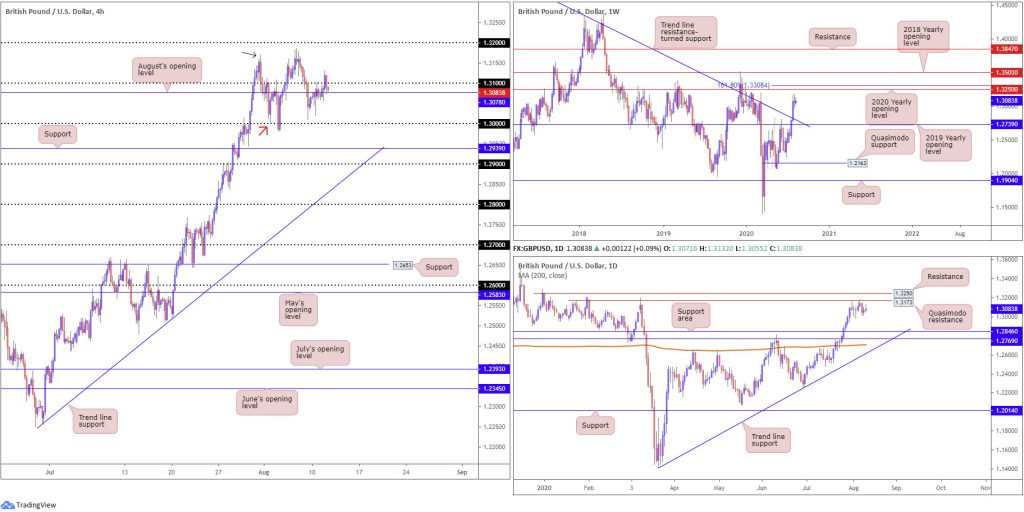 Daily Quasimodo resistance at 1.3173 entered the fold last week, a level situated south of 1.3250 daily resistance. Interestingly, the latter shares the same space with resistance on the weekly timeframe, the 2020 yearly opening level. An extension to the downside may have a support area between 1.2769/1.2846 nudge its way into focus, positioned ahead of the 200-day SMA (orange – 1.2706) and trend line support, taken from the low 1.1409.