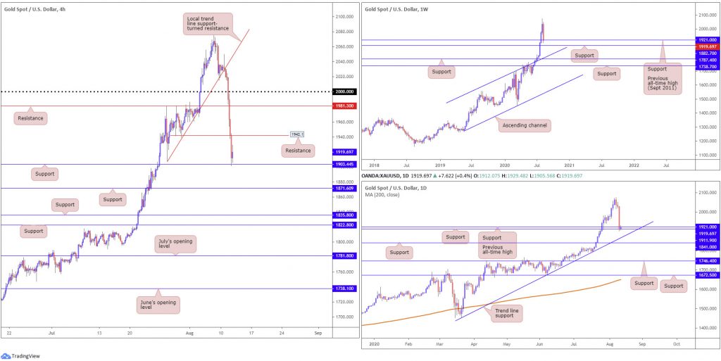 While many stop-loss orders have likely been filled due to the recent plunge, buyers still potentially have a hand in this fight. Not only has the trend in this market faced north since 2016, higher timeframe supports are in motion. As a result, a H4 bullish candlestick signal developing off the H4 support at $1,903.44 today could appeal, targeting $1,942.10 as an initial port of call.