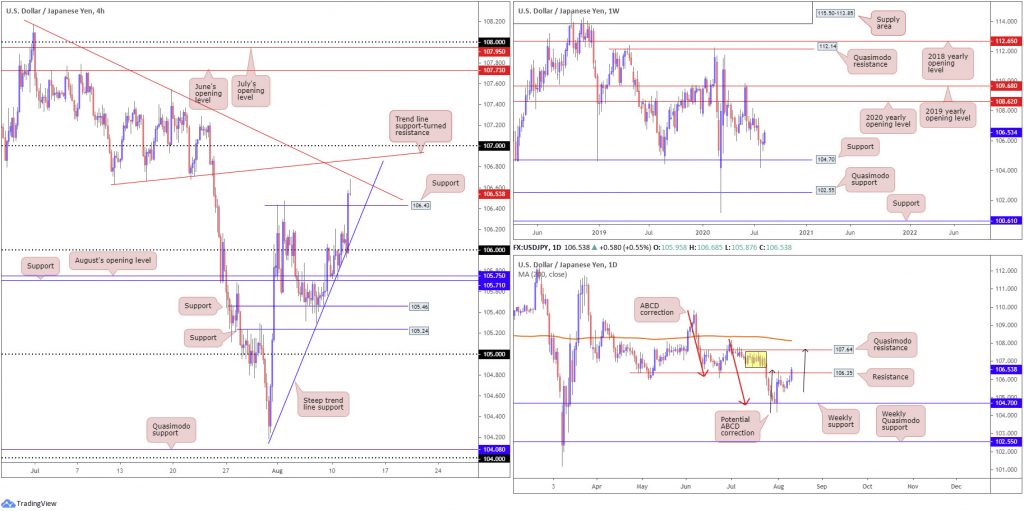 Going forward, a retest at 106.43 support could be seen (prior H4 Quasimodo resistance). This, having noted higher timeframes shining the spotlight north, could lure dip-buyers from 106.43, targeting H4 trend line resistances nearby (106.63/108.16).