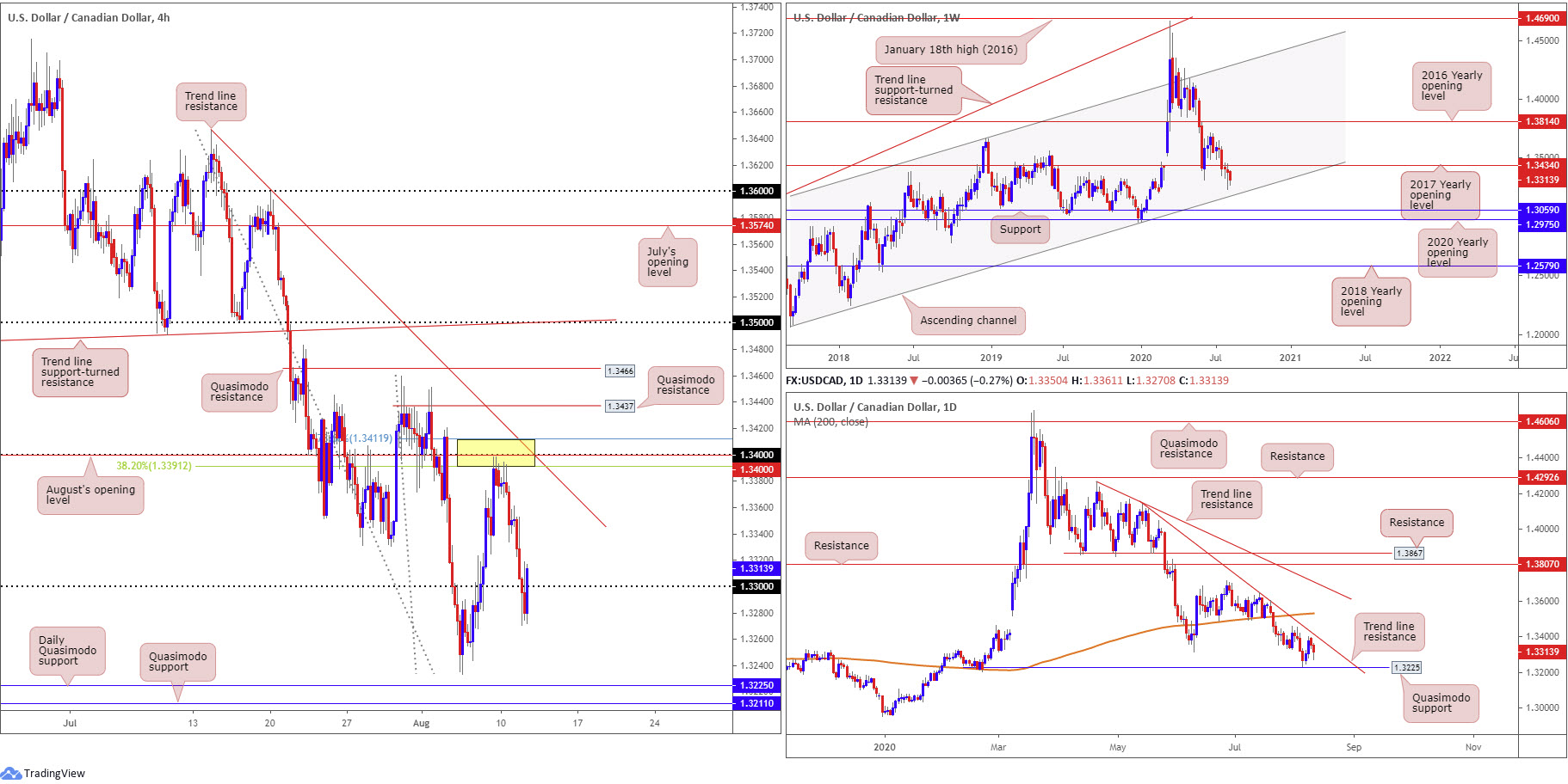 Price action on the H4 timeframe, as you can see, nosedived through 1.33 and filled sell-stop liquidity Tuesday. Recent moves, however, did make a comeback and reclaimed 1.33+ status as WTI prices closed off best levels.