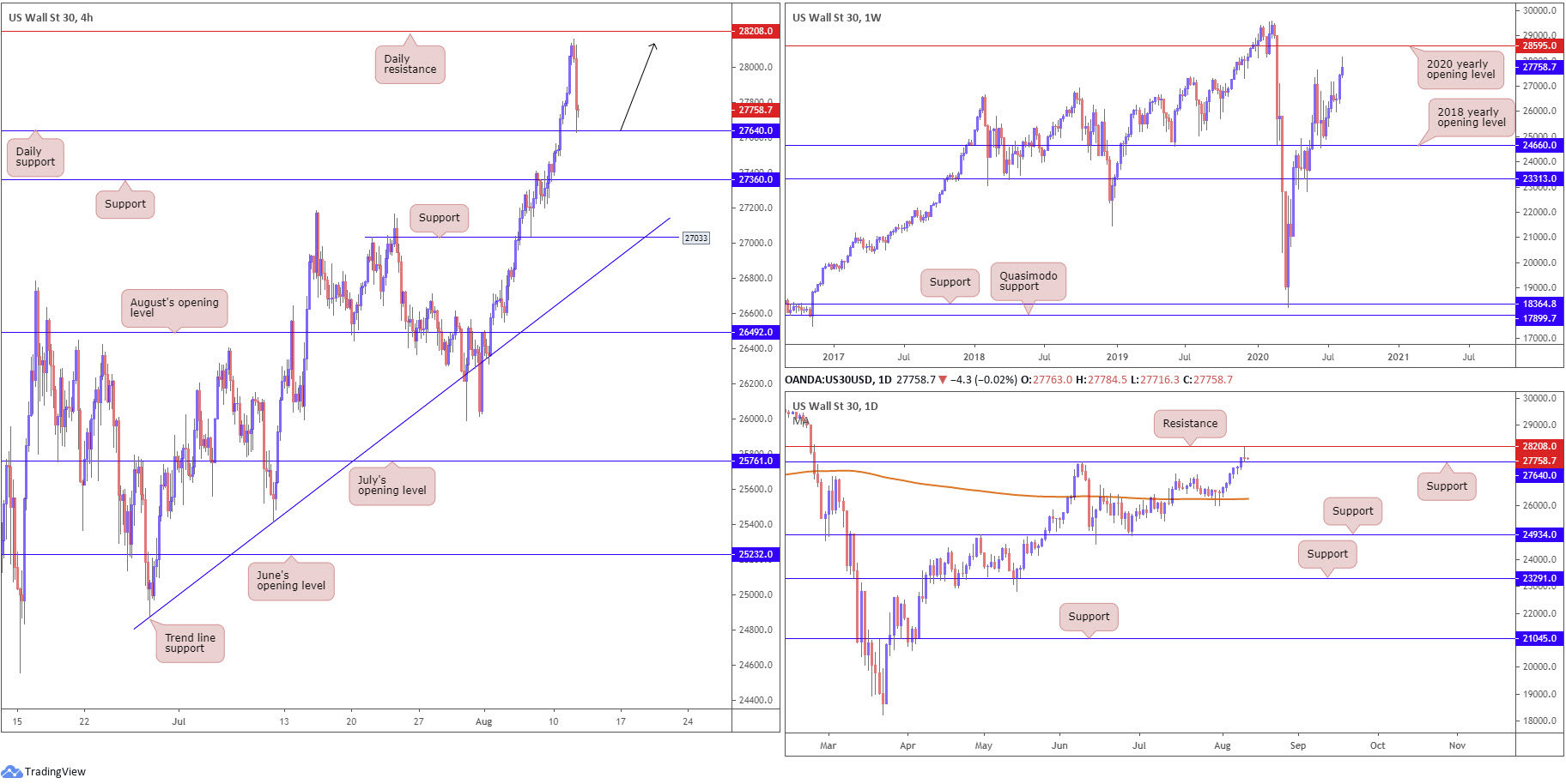 Technically, from the weekly timeframe, we recently secured ground above the 27638 high, following a mid-June retest at the 2018 yearly opening level from 24660. As we head into Wednesday, the unit is now poised to run to the 2020 yearly opening level at 28595. After retesting the 200-day SMA (orange – 26258) on the daily timeframe, in the form of back-to-back hammer candle patterns, recent trading crossed resistance at 27640 (now a serving support) and came within touching distance of connecting with resistance at 28208.