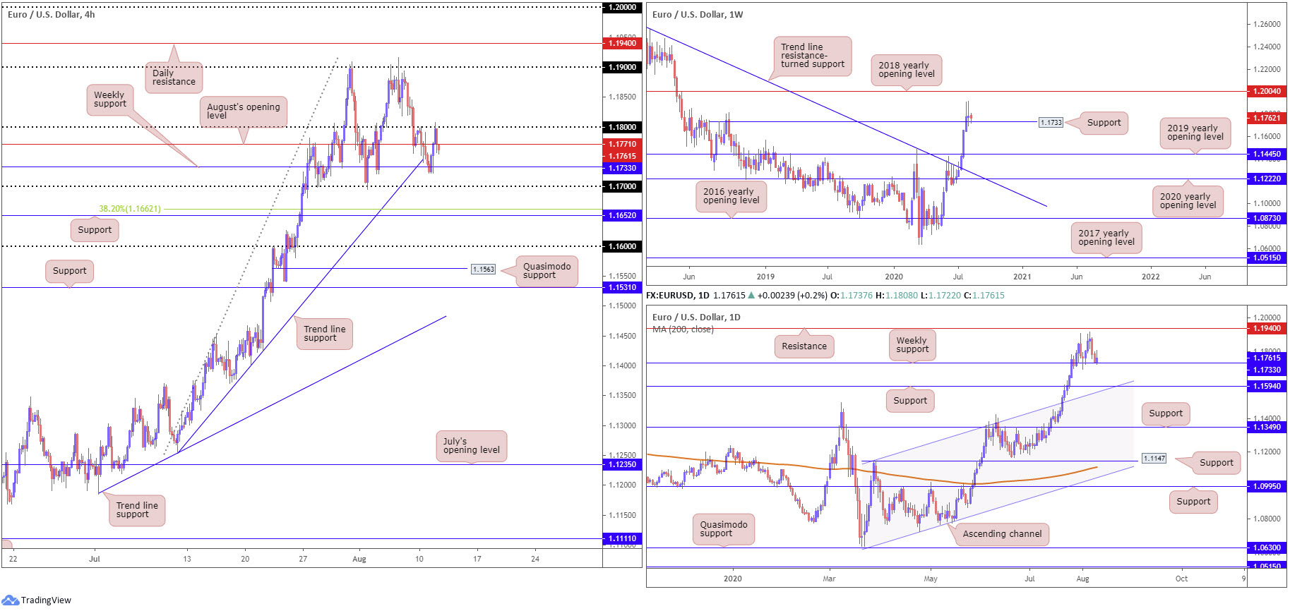 Tuesday, as anticipated, responded to 1.1733 weekly support, with the help of H4 trend line support, etched from the low 1.1254. From here we ran through August’s opening level at 1.1771 and shook hands with the 1.18 handle. Unfortunately, given the DXY traded considerably off worst levels, we failed to make it past 1.18 and pulled back under August’s opening level at 1.1771.