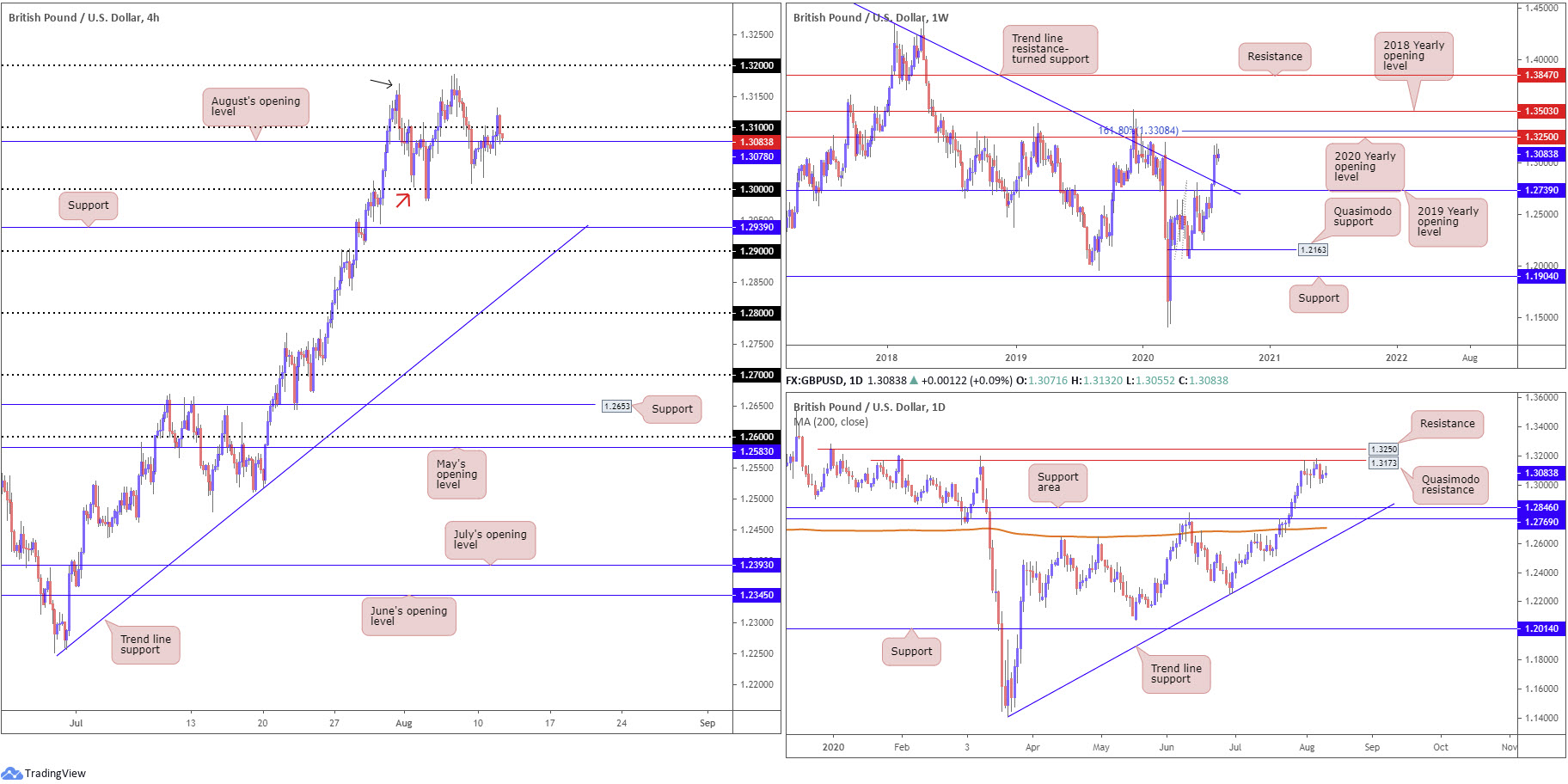 Buy-stop liquidity north of 1.31 was filled during London hours on the H4, as the unit tested peaks at 1.3132. In the shape of a two-candle fakeout, however, price is currently seen trading under the aforementioned round number and touching gloves with August’s opening level at 1.3078.