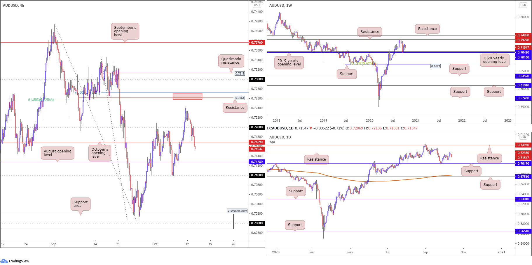 Yesterday’s bearish tone was always going to be an option, given daily price hugging the underside of a reasonably notable resistance at 0.7235. However, having seen weekly price showing room to march higher, moves north were also a possibility. As a result of recent selling, though, the 2020 (0.7016) and 2019 (0.7042) yearly opening levels applied to the weekly timeframe are logged as the next potential higher timeframe support targets.