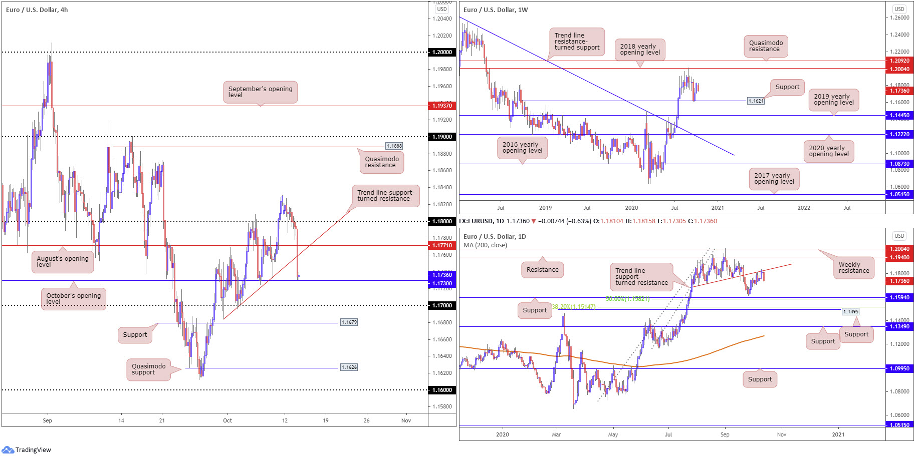 Technical price action on the H4 lost grip north of 1.18, and subsequently overthrew August’s opening value at 1.1771 and a trend line support, extended from the low 1.1684. As you can see, buyers and sellers are now wrestling for position a few points ahead of October’s opening value at 1.1730, with a break here exposing the 1.17 handle.