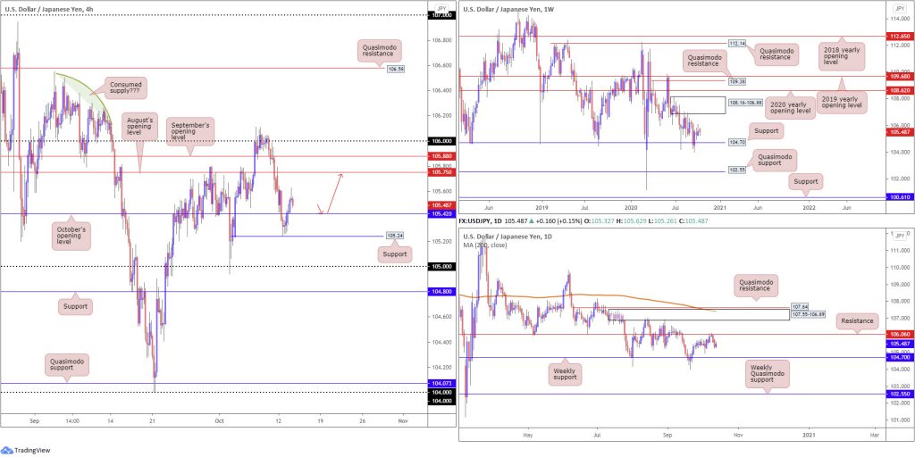 A retest at October’s opening value from 105.42 (H4) is a potential intraday bullish scenario (red arrows), targeting 105.75/105.88. As you can probably see, the setup lacks higher timeframe confluence. For that reason, conservative buyers might seek (at least) additional H4 candlestick confirmation before pulling the trigger.