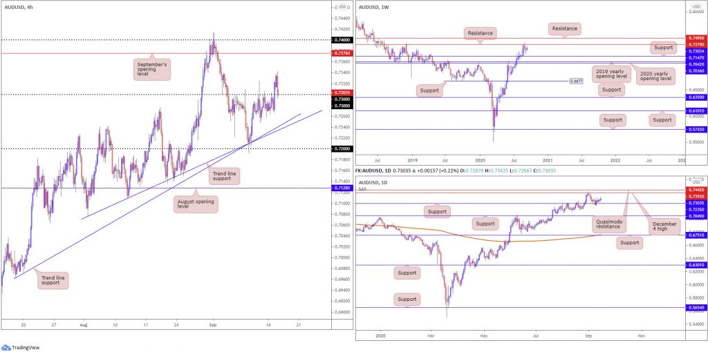 As evident from the H4 chart this morning, AUD/USD latched onto a healthy bid Tuesday, ripping through any defence 0.73 had in place. Peaks of 0.7342 were achieved before the pair reclaimed earlier gains and retested 0.73 as support.