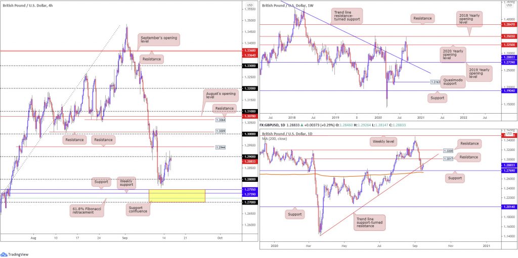 As the DXY closes out Tuesday off worst levels (92.79), EUR/USD on the H4 spun lower from the 1.19 handle in reasonably strong fashion. Above 1.19, September’s opening value is seen at 1.1937; to the downside 1.18 invites an approach. Beyond 1.18, Quasimodo support at 1.1781 is visible, followed by August’s opening level at 1.1771.