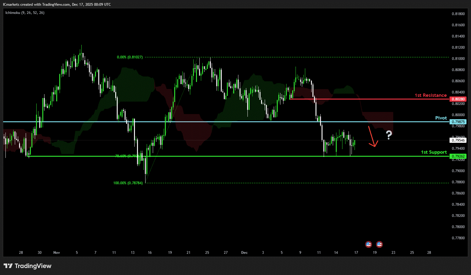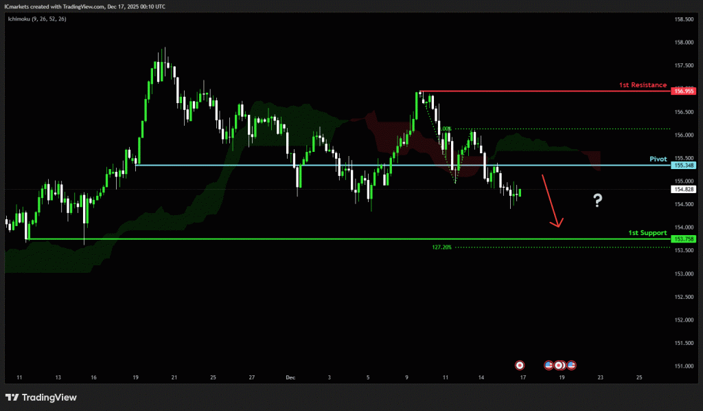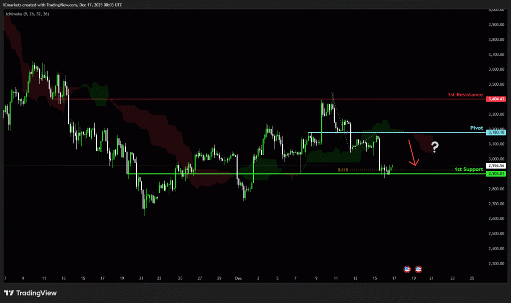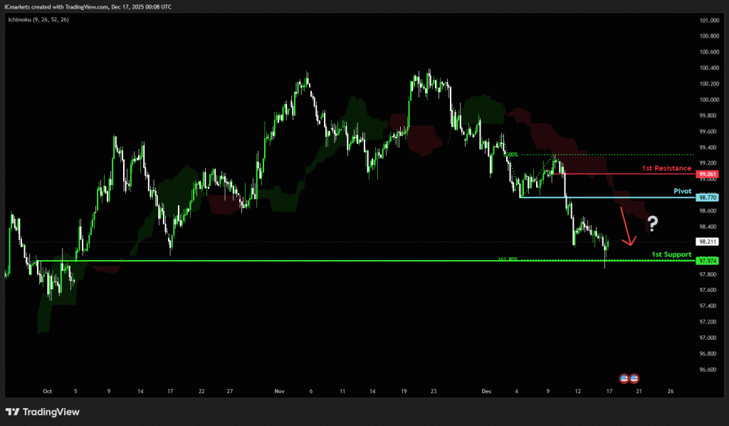 The price could see a short-term pullback toward the pivot before continuing its bearish move down toward the 1st support.
