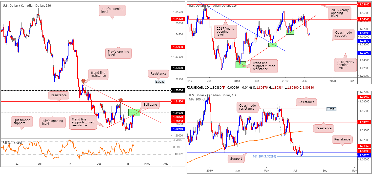 H4 Quasimodo support at 1.3028, as you can see, continued to cap downside yesterday and propelled price action beyond July’s opening level at 1.3087 to highs seen just south of 1.31. Note we also have a local trend line support-turned resistance (taken from the low 1.3037) in motion, too. Also of interest, beyond 1.31 trend line resistance is in view, extended from the high 1.3229.