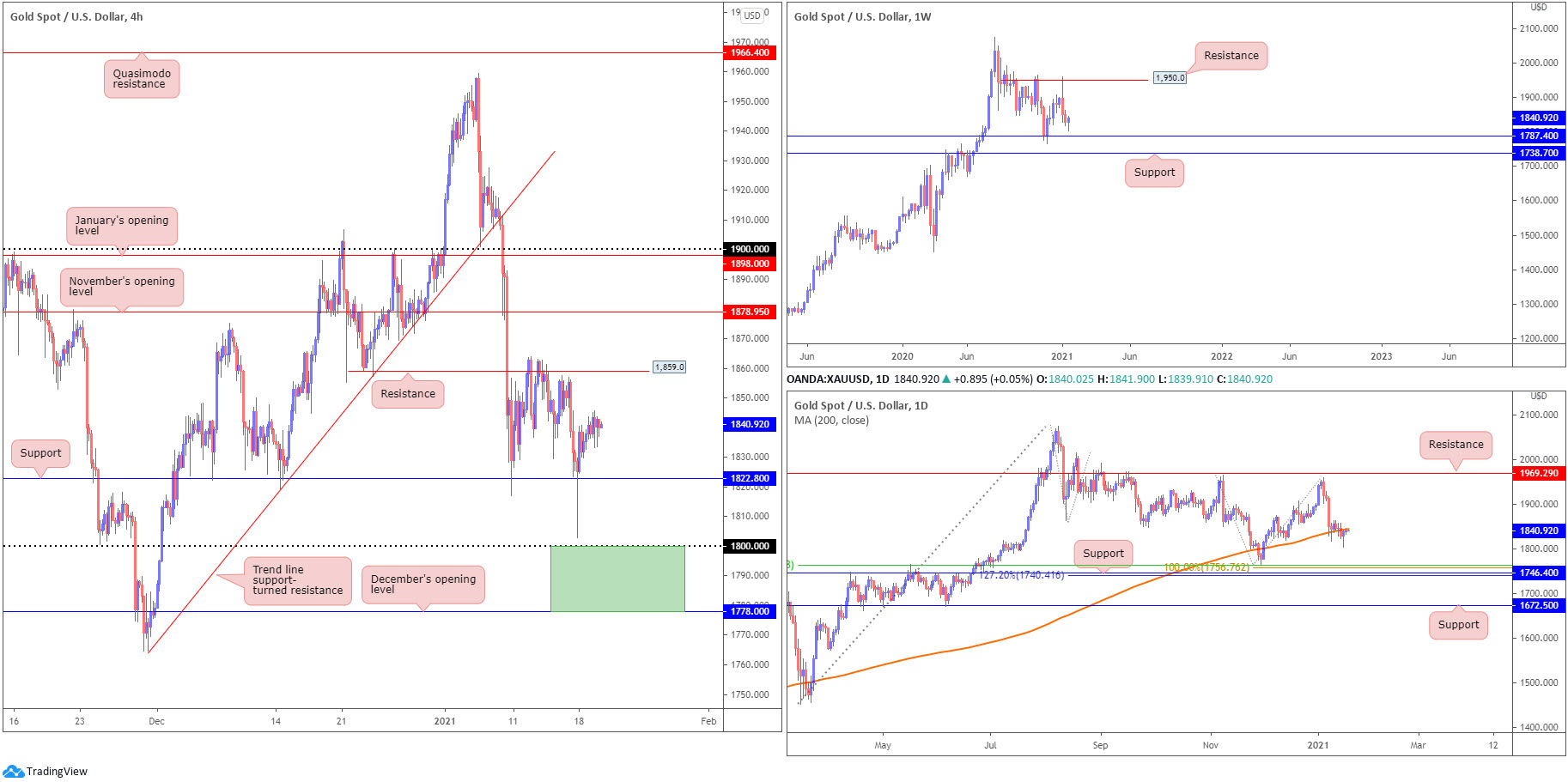 - Weekly support mentioned above at $1,787 resides between $1,800 and December’s opening value at $1,778 on the H4 scale. Therefore, the area marked on the H4 timeframe (green) between $1,778 and $1,800 is a location to be mindful of.