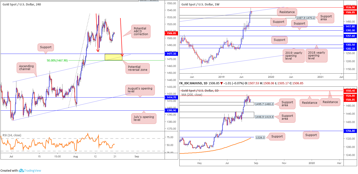 Kicking things off with a look at the weekly timeframe this morning, we can see the yellow metal trades marginally beneath channel resistance (etched from the high 1375.1), targeting a support area at 1487.9-1470.2. Overhead, it is also worth keeping a tab on resistance at 1536.9. The story on the daily timeframe has price action rebounding from a support area coming in at 1495.7-1480.3 (glued to the top edge of the weekly support area), with the possibility of a run materialising towards resistance at 1526.8.