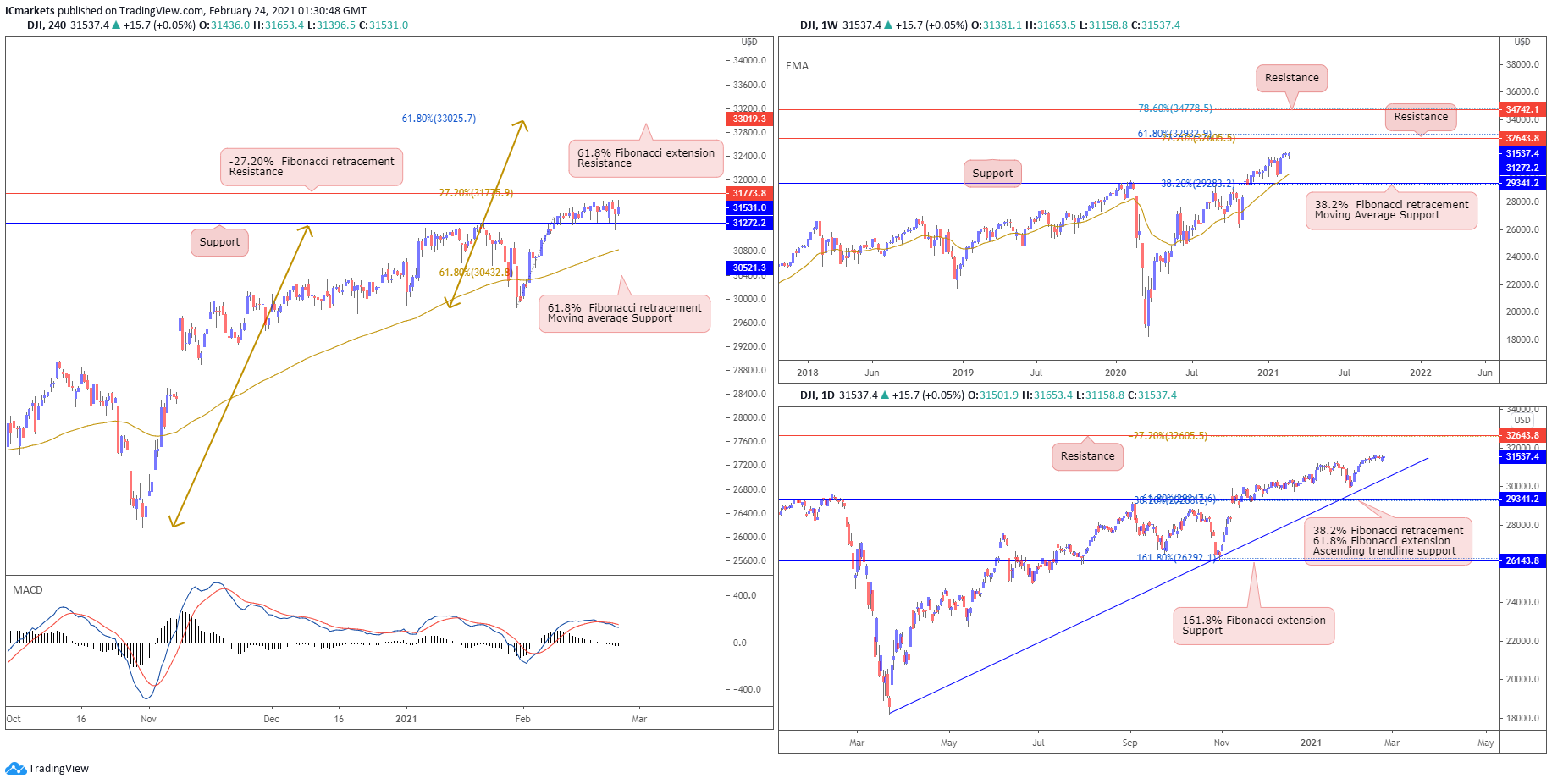 On the H4, price continues to drift sideways holding between key support at 31272 and resistance at 31773. We note that Technical indicators continue to show room for further bullish upside. Watch resistance at 31773 closely as a break and close above would mean seeing more buyers entering with their longs to push price higher, possibly towards 33019. Otherwise, failure to hold above 31272 could see price swing back and come back to the 61.8% Fibonacci retracement level and moving average support at 30521.