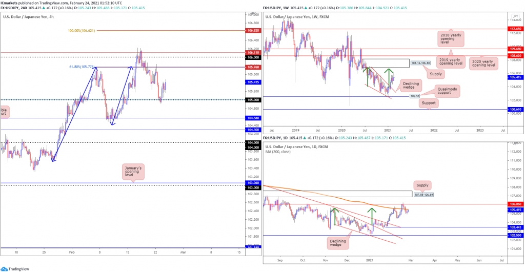 The US dollar bounced higher on Wednesday morning , where it retested the 105.00 figure support and bounced from there ( 61.8% fib extension ).Price steadies above the 105 figure support level, we could see buyers step in further and push price higher again towards the 105.76 resistance level.