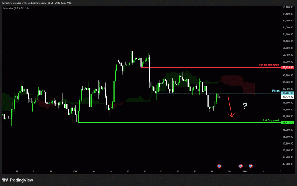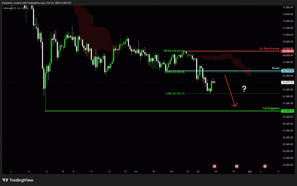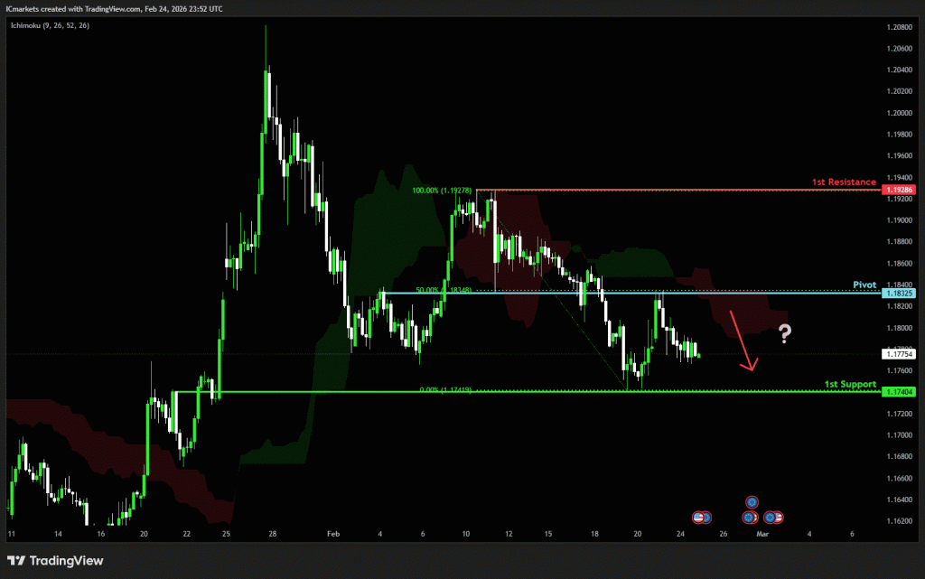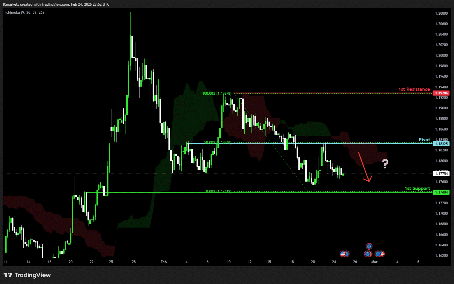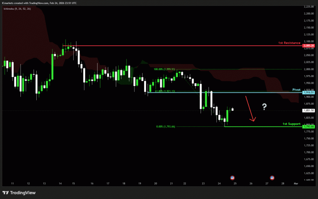 The price could see a short-term pullback toward the pivot before continuing its bearish move down toward the 1st support.
