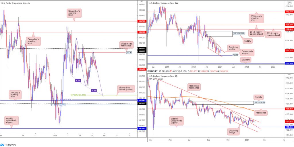 The US dollar elbowed lower against the Japanese yen on Tuesday, following Monday’s H4 Quasimodo rejection at 103.93 (sited just south of the 104 figure). Bearish focus has likely shifted towards Thursday’s low at 103.32, with a decisive break exposing a three-drive bullish pattern at 103.15, closely shadowed by the 103 figure.