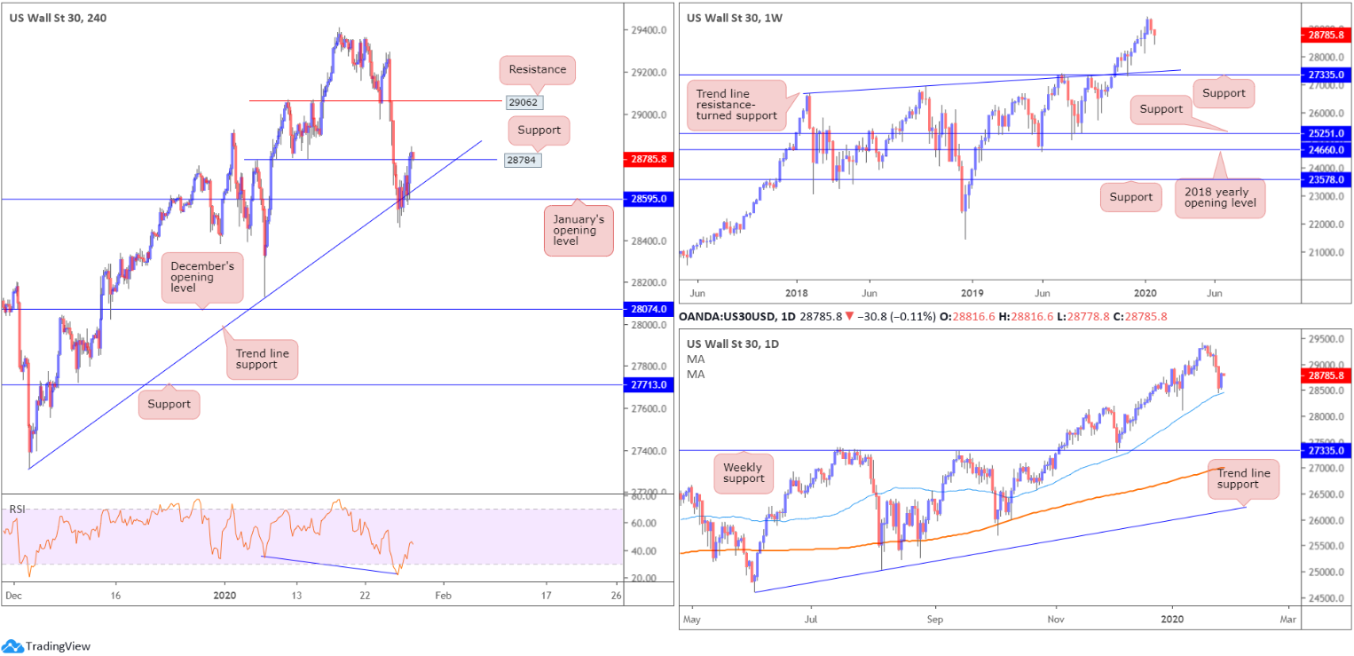 Technical research, based on the H4 timeframe, demonstrates price action recovered from trend line support, extended from the low 27314, and January’s opening level at 28595, which was confirmed by the relative strength index (RSI) forming hidden bullish divergence within oversold territory (blue line). Well done to any readers who found a long from this angle as price recently cut through resistance at 28784 (now serving support); this was a noted reversal zone in Tuesday’s analysis.