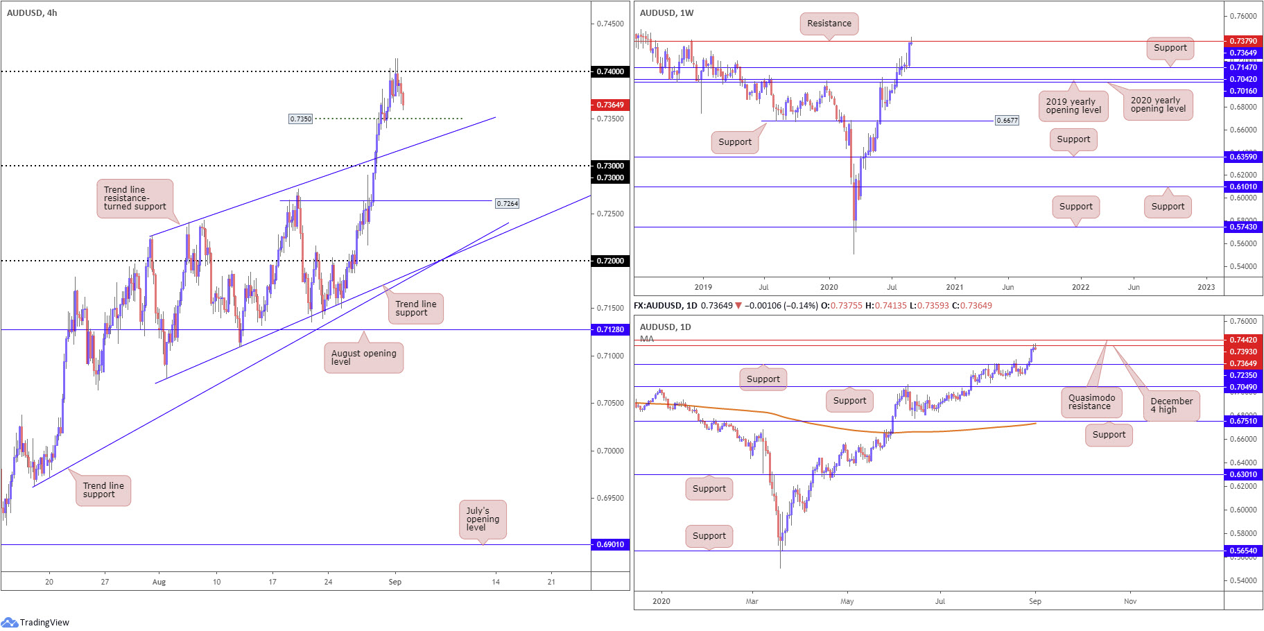 Following two back-to-back whipsaws above 0.74 on the H4, AUD/USD fell into negative territory during US hours on Tuesday, positioning 0.7350 back in the firing range as viable support today. A break to deeper waters, on the other hand, could throw a trend line resistance-turned support, taken from the high 0.7227, in the pot, followed by the 0.73 handle.