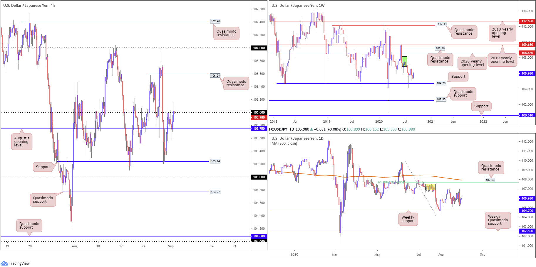 Although H4 is threatening moves back above 106, we can see supply remains prominent on the weekly timeframe at 108.16-106.88 (dark green) after price made its way off support at 104.70 at the end of July. Last week’s movement ended in the form of a strong selling wick, positioning the aforementioned support back in the fold. Should buyers hold onto recent upside, the 2020 yearly opening level at 108.62 may eventually enter view, closely followed by Quasimodo resistance at 109.38.