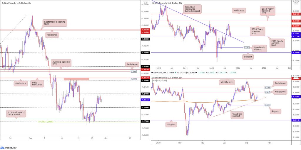 Sterling held onto a moderately bullish tone Tuesday, recording a fourth consecutive daily gain. From a technical standpoint, H4 recently knocked on the door of 1.29, a level that’s withstood two upside attempts this week. In spite of this, sellers offer a non-committal tone at the moment.