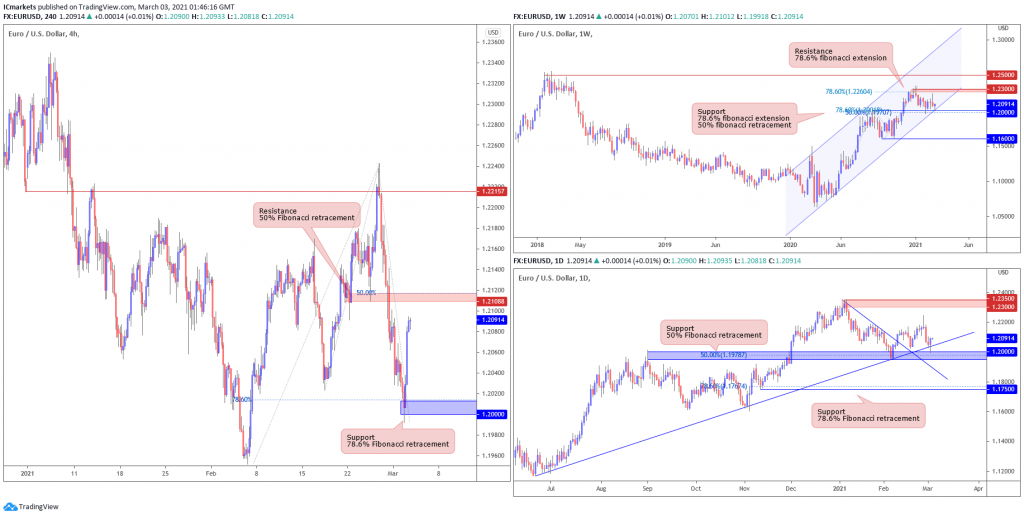 On the H4 timeframe, prices bounced nicely off our support level at 1.2000, in line with the levels found on the larger time frames. Currently, prices are approaching our resistance area at 1.21088 found on the H4 time frame, which coincides with the graphical pullback resistance area and 50% Fibonacci retracement. A break above this resistance area could see a further upside to test our next resistance target at 1.22157, in line with our graphical overlap resistance area.