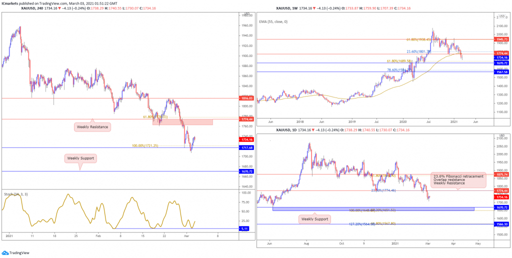 On the 4H timeframe price testing and reacted above 1717 support which is also in line with Key 100% Fibonacci extension level. With stochastics on support where price bounced in the past, a short term intraday bounce towards 1774 weekly resistance could be likely before seeing any chance of a drop. However, should price fail to hold above 1717 support, traders can also expect price to drop towards next weekly support at 1670 level.