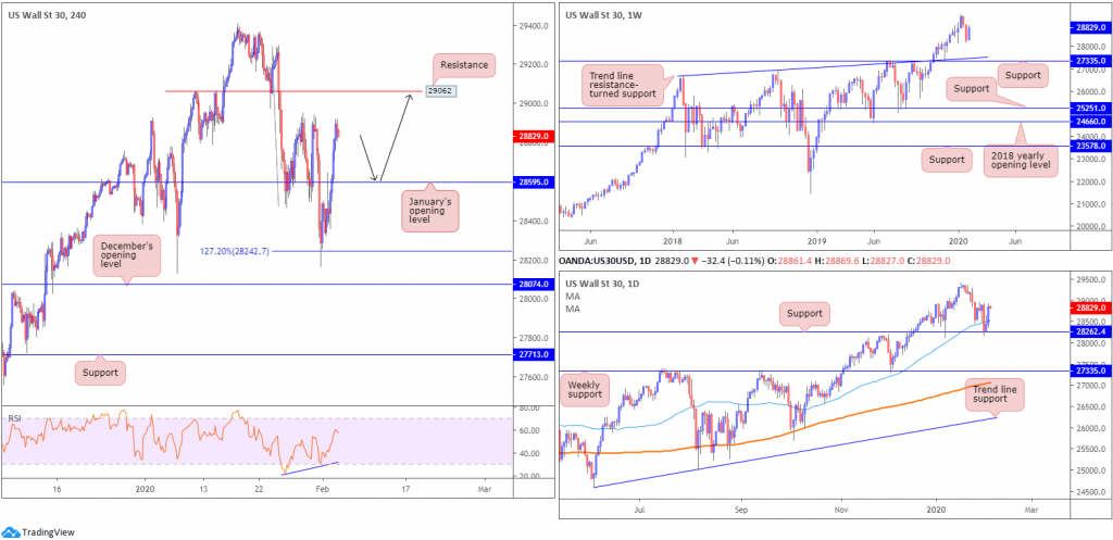 Monday rallied from daily support at 28262, which saw price extend gains yesterday and jump back through the 50-day SMA (blue – 28532). In addition to this, H4 movement found support off a 127.2% Fibonacci extension at 28242, confirmed by the relative strength index (RSI) producing bullish divergence (blue line). Tuesday, on the H4 timeframe, witnessed a strong close through January’s opening level at 28595, settling a few points south of familiar tops around the 28940ish region.