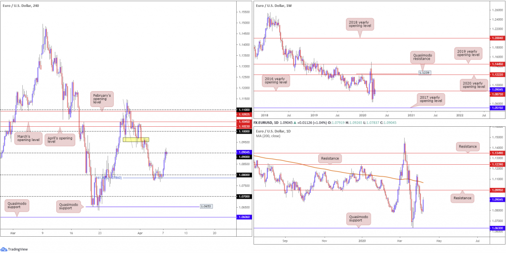 Price action made short work of 0.61 and merging April’s opening level at 0.6112 on the H4 timeframe, leading to a charge towards 0.62, which also represents a Quasimodo resistance (black arrow). Directly above lies an interesting area of Fibonacci studies – typically referred to as a Fibonacci cluster. 0.63/0.6237 is comprised of the 0.63 handle, two 161.8% Fibonacci extension points at 0.6272 and 0.6279, a 61.8% Fibonacci resistance point at 0.6237 and a 127.2% Fibonacci extension point at 0.6299.