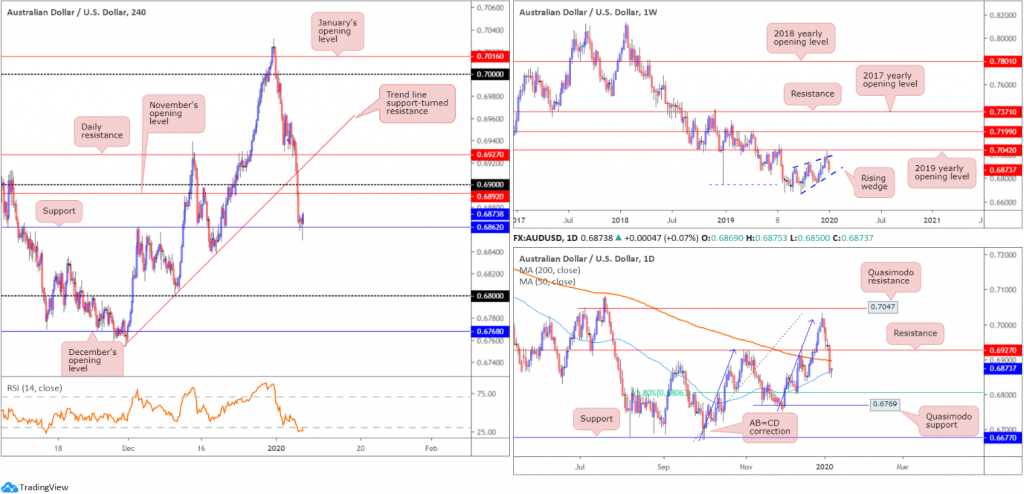 Although weekly price is suggestive of further declines, an intraday long position off the current H4 support at 0.6862 is an option. Knowing the level boasts a connection to the 50-day SMA, an advance to at least November’s opening level on the H4 at 0.6892/200-day SMA is certainly a possibility. In addition to this, the recently closed H4 candle put in a reasonably obvious hammer candlestick pattern (a bullish signal at troughs).