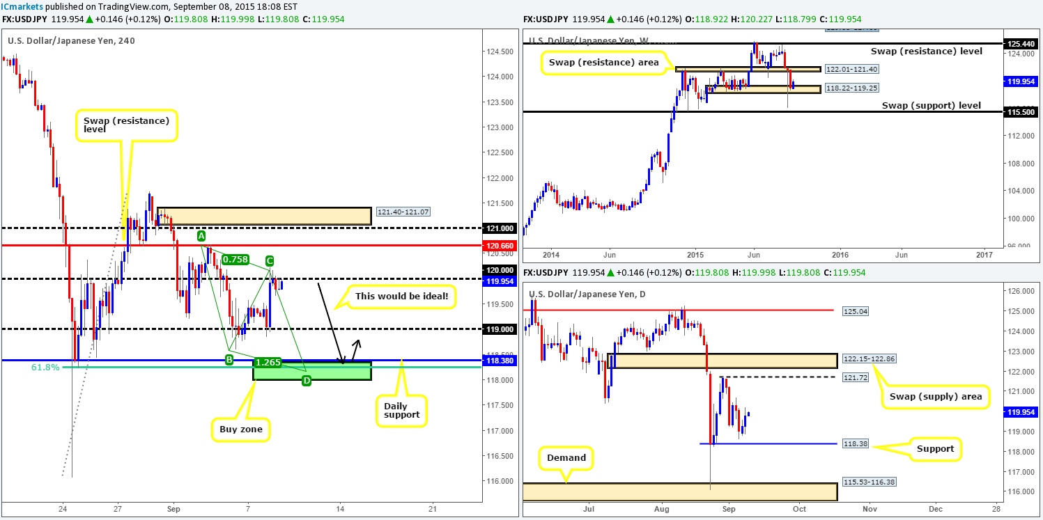 Going into the early hours of European trade, a strong wave of bids rippled through the USD/JPY market from 119.00, sending price 100 pips up to 120.00. For those who read our previous report http://www.icmarkets.com.au/blog/tuesday-8th-september-daily-technical-outlook-and-review/ you may remember us mentioning that we were interested in trading a 4hr Harmonic AB=CD pattern  that completed just below 118.38. As is evident from the chart, this pattern, at least according to our rules of engagement, has been invalidated – we insist on symmetry.